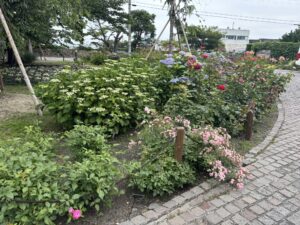 びわこ大津館玄関前の庭にはバラがいっぱい咲いていました 教室始めるまでにたくさんのバラの写真を撮りました。バラの種類もたくさんで香りとともに癒されました