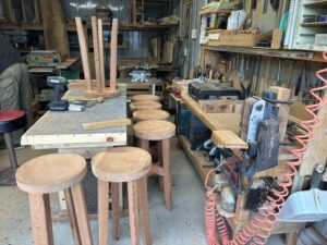 久しぶりの工房 ウェルカムチェア作業開始しました かつらの木です 脚は雑木ですが自然な4本足は楽しんでいただけます。背もたれもとても可愛く仕上げていきます。