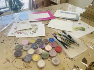 自宅は雪景色の中 琵琶湖大津館まで来ましたら 晴れの青い空の景色。同じ大津でもこれだけ違うのか驚きました。 白樺の皮を使ってお家を作ります 紅葉の葉をフローリングに。異質な材料を使用したり退色したはっぱを使って描きます。 […]