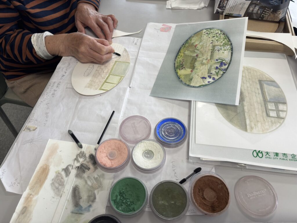 今日は パステルで台紙作り 毎回ご自分で 台紙を作っていただきます。生徒さん緊張されています。