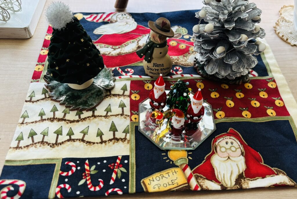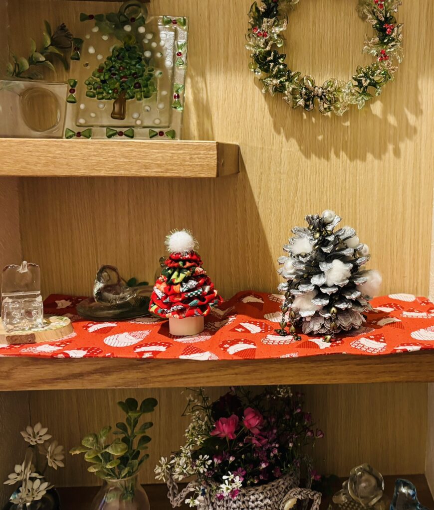毎年のクリスマス 大きな木の玄関 おし花教室内 トイレにもサンタさん ツリーなど可愛いグッズを収集しています。まつぼっくりの大きいのをいただき可愛いツリーに仕上げています。毎年少しずつグッズが増えていきます。