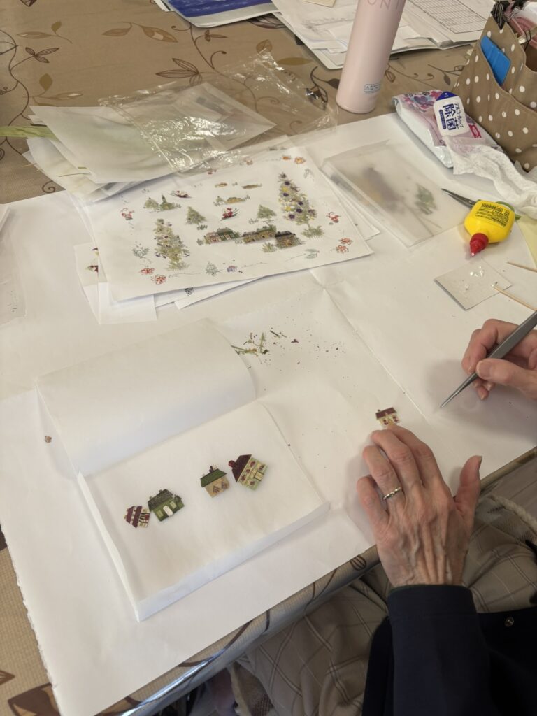 上の写真はネコ ネズミさんを作成中。 下段の作品はクリスマス作品となります。今から?今からちまちまと作っていかれます。カラフルなお家も使っていきます。