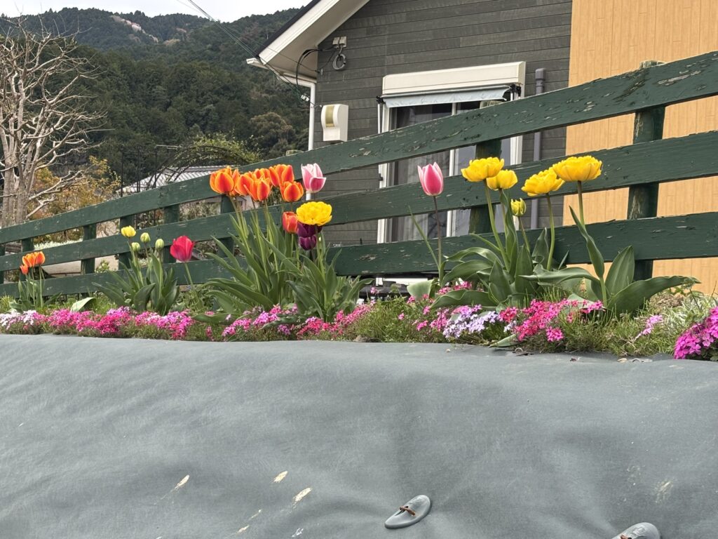 毎年楽しみにしていました土手に芝桜がいっぱいだったのですが今年より防草シートになりましたが 土手の上にはチュウリップ