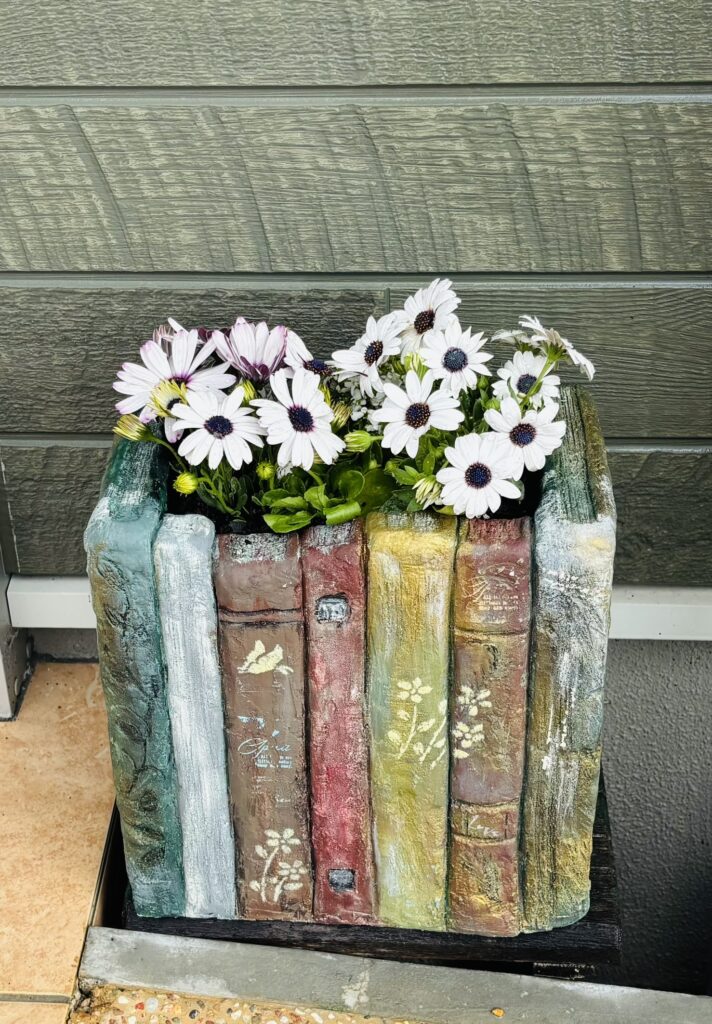 さみしいい庭が一気に広がりを感じさせてくれます。まだまだ土が見えているところもありですが。気分もるんるんです 昨年に教えていただいたモルタルデコのキノコのお家 karucyz^先月に教えていただいたブックの鉢にも白い花を植えこみました